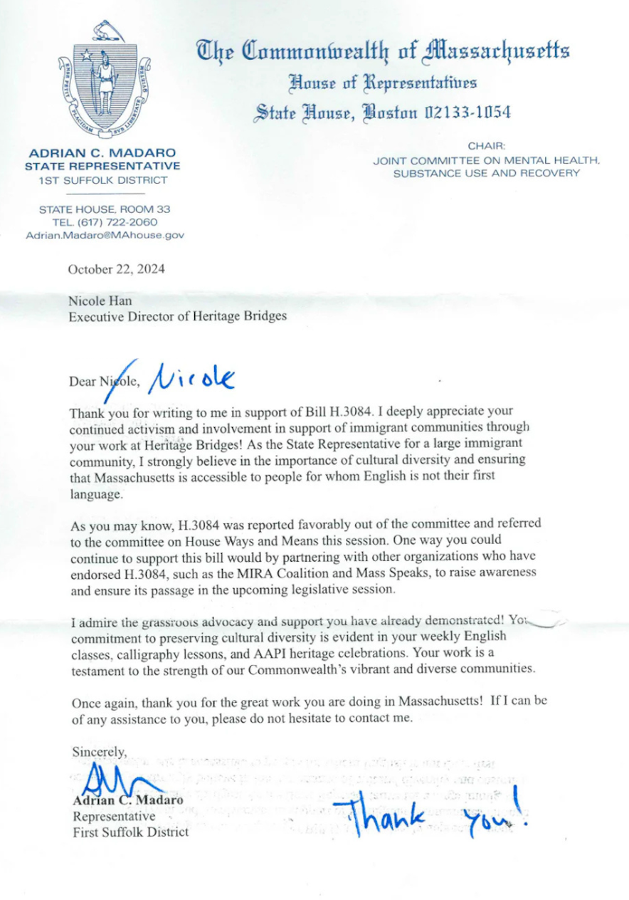 Heritage Bridges received recognition from the Commonwealth of Massachusetts through a letter from Representative Adrian C. Madaro. This acknowledgment highlights our ongoing advocacy for Bill H.3384: An Act Relative to Language Access and Inclusion, filed by Representatives Madaro of Boston and González of Springfield.
